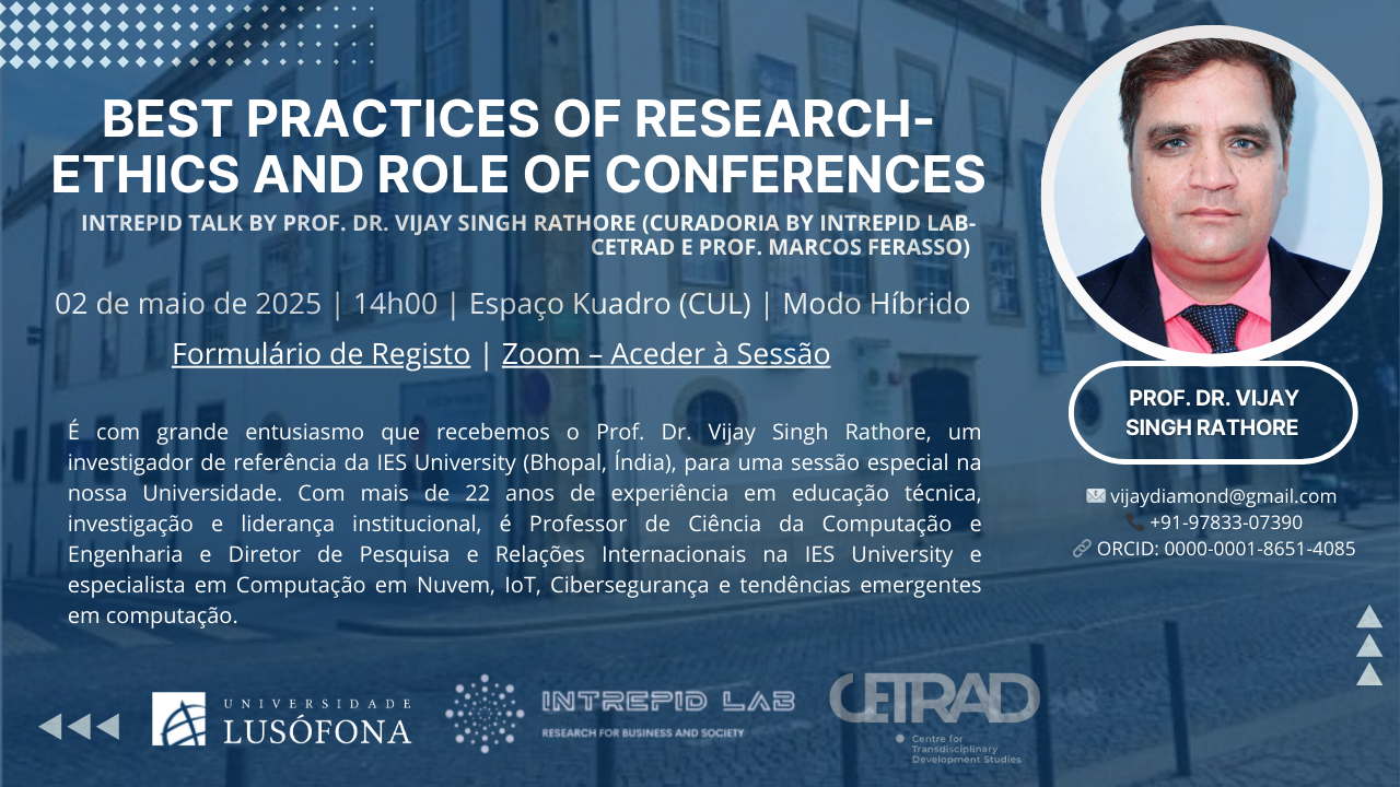 Título: Best Practices of Research-Ethics and Role of Conferences Data: 02 de maio de 2025 Hora: 14h00 Local: Espaço Kuadro, Universidade Lusófona - CUL (formato híbrido) Participação online:ZOOM