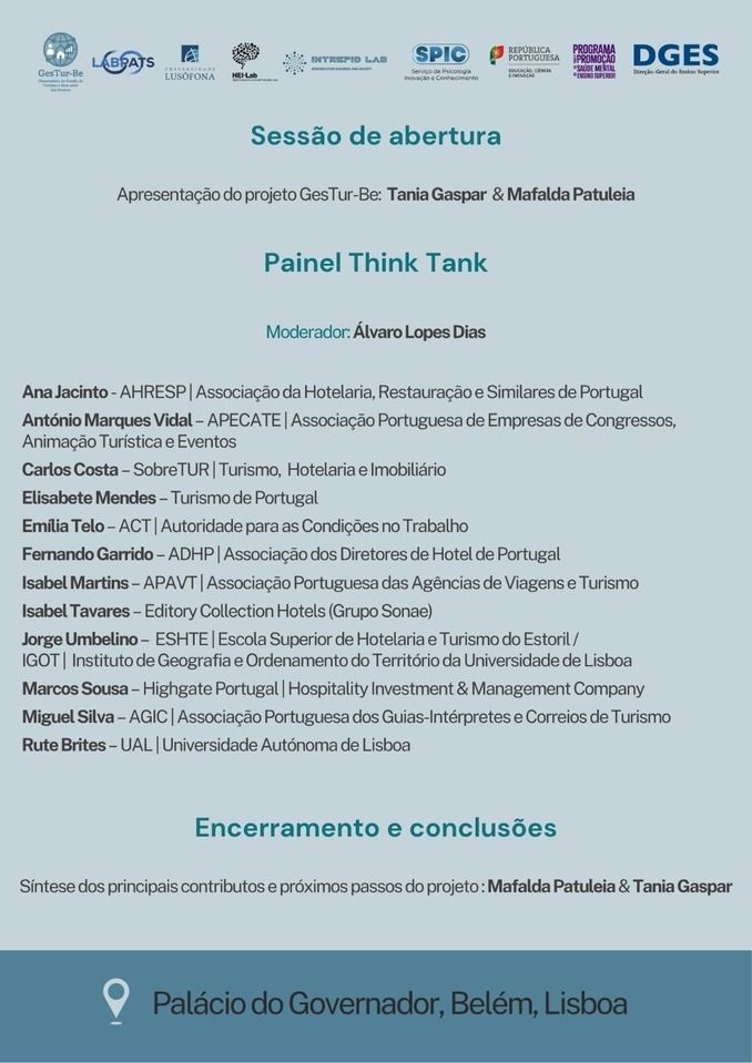 GesTur-Be. Este projeto visa o estudo aprofundado da gestão e do bem-estar dos profissionais do turismo e da hospitalidade, bem como das respetivas organizações, promovendo a comunicação e o diálogo entre organizações, profissionais e outros stakeholders relevantes.