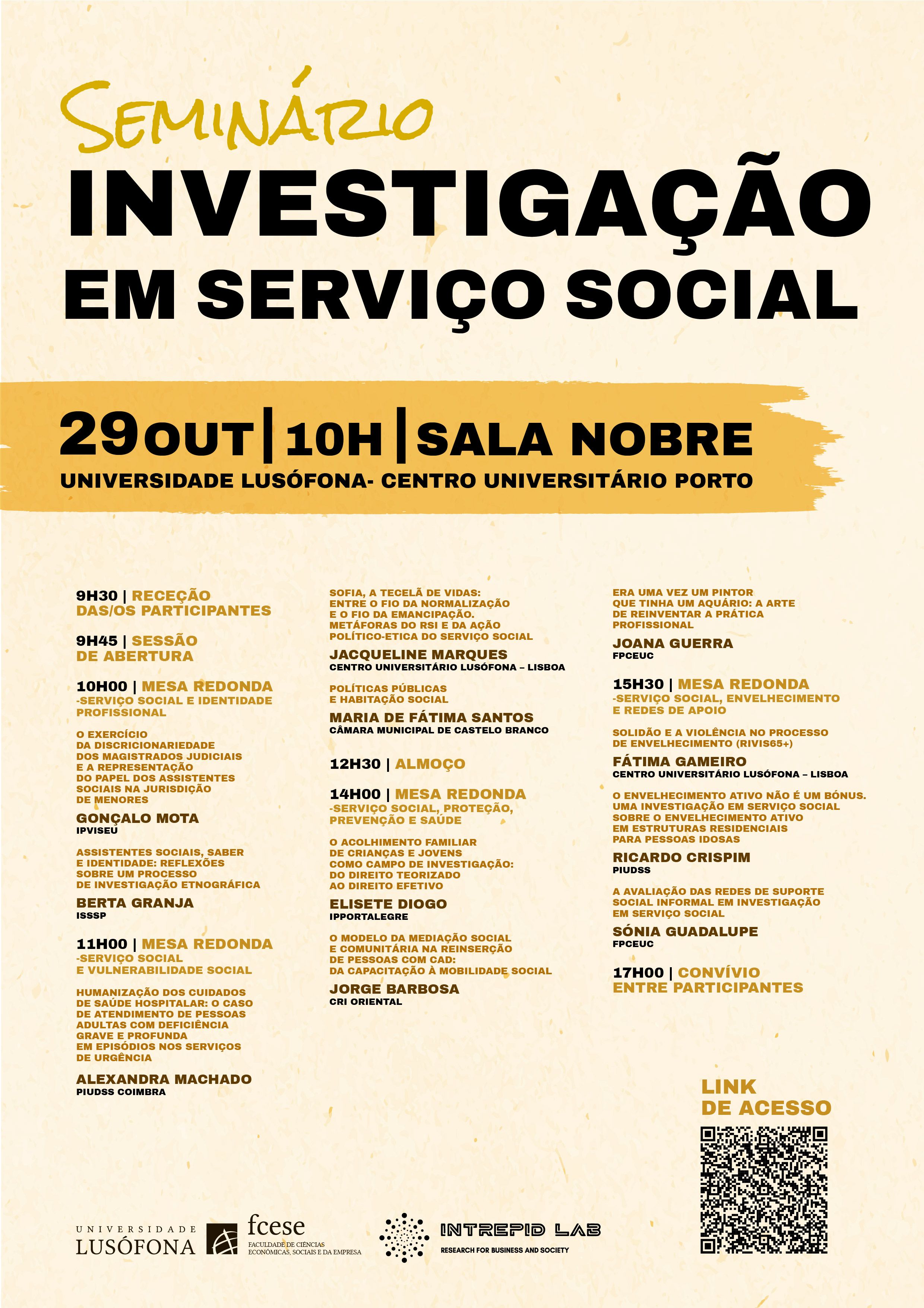 Realizou-se no dia 29 de outubro de 2025 às 10h, no Salão Nobre do Poló 1 da Universidade Lusófona - Centro Universitário do Porto, o Seminário de Investigação em Serviço Social.